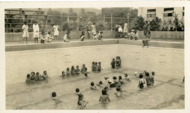 Low tide at Palama Settlement pool, circa 1930. Youth learn to swim during "low tide", when the water from the artesian well is drained in the pool. -