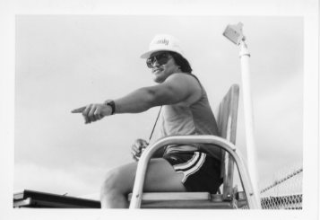 Lifeguard sitting on chair pointing at unknown subject, 1985. Neg. 13-20. -