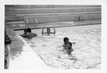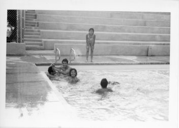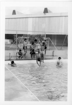 Youth swimming and playing in the pool, 1985. Neg. 13-12. -