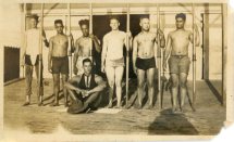 Shigeo Arakawa instructor is teaching youth swimmers how to stretch, 1954. -