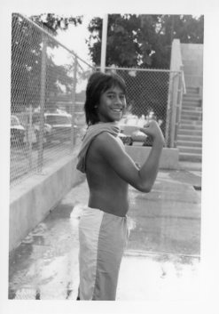 Male youth swimmer showing his bicep muscles, 1985. Neg. 13-11. -