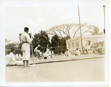 Youth boys doing drill exercises at Palama Settlement field, 1940-1950.