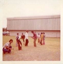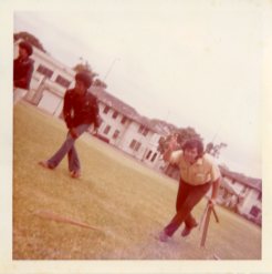 Teen boys playing throwing spears at Palama Settlement field, 1973. -