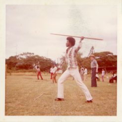 Female in ready stance to spear throw at Palama Settlement field, April 1973. -
