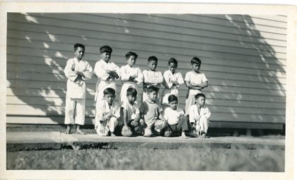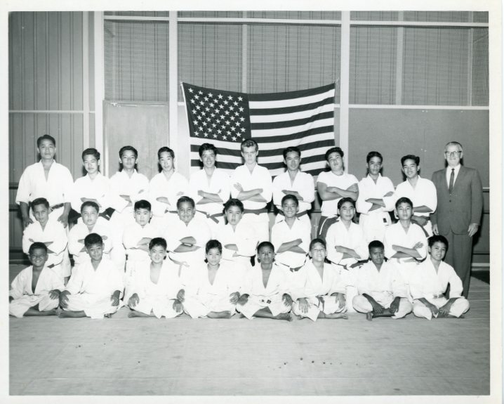 Judo class poses for photo with Arne Larson Executive Director, 1959-62. -