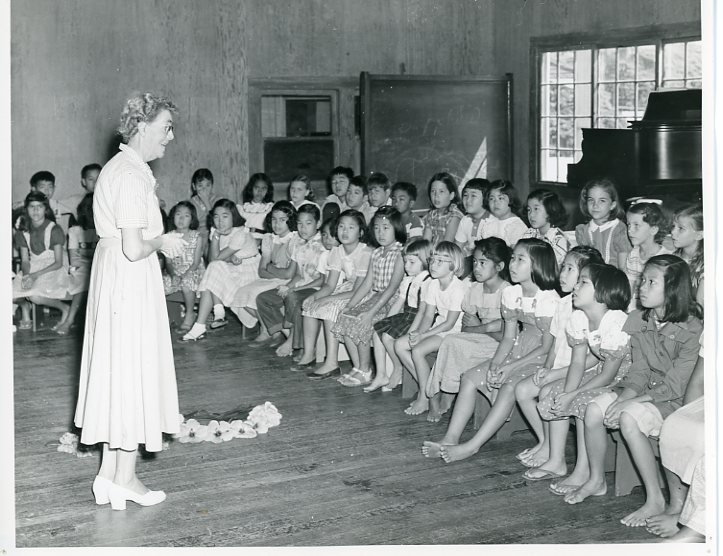 Keum Nyu Park leads the children's chorus at the Palama Settlement Music School, March 1954. -