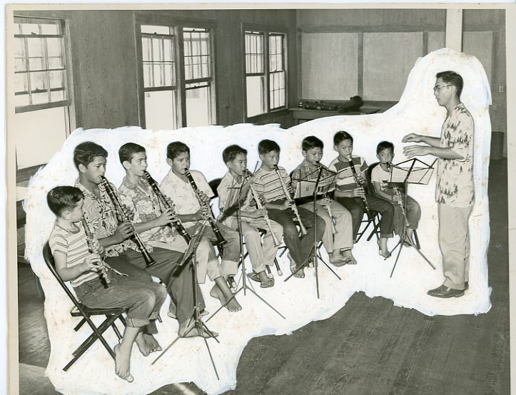 Eugene Yonamine rehearses the clarinet section of the Palama Settlement band, which gets active support from the Kiwanis Club of Honolulu, November 6, 1954. Background whited-out for camera-ready layout in the Honolulu Star-Bulletin, printed on November 6, 1954. -