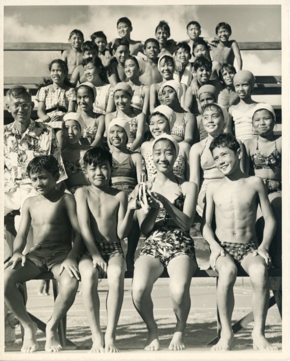- Likelike school swimmers posing with their instructor, 1950.