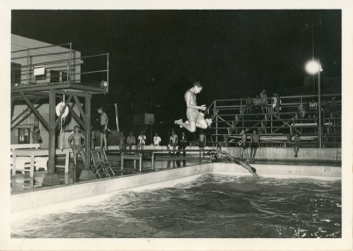 - Swimmers jumping into Palama Settlement pool off of the diving board, 1962.