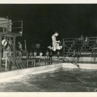Swimmers jumping into Palama Settlement pool off of the diving board, 1962.