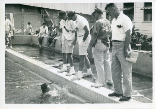 - Swim meet officials timing a swimmer in Palama Settlement pool, 1950.