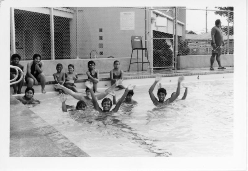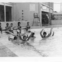 Youth swimmers waving at the camera, 1985. Neg. 13-8.