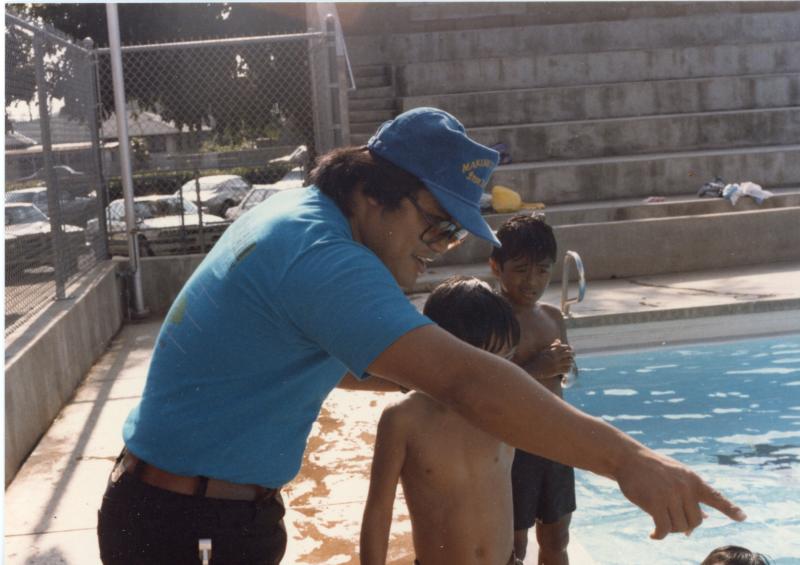 - Swim instructor with a youth swimmer, pointing at another student, 1988.
