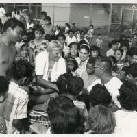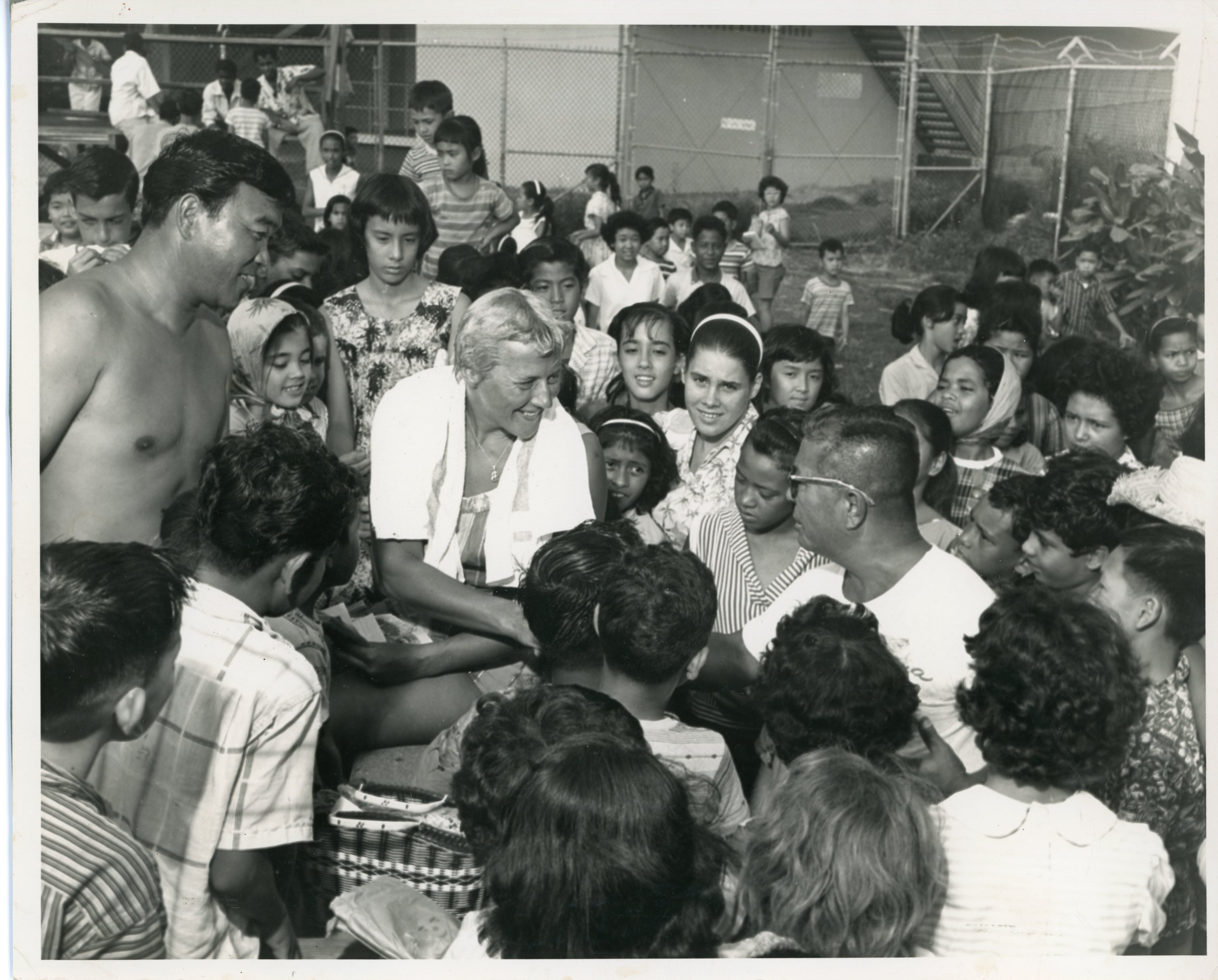 Group of people meeting Greta Anderson at the Palama Settlement Pool, 1930.