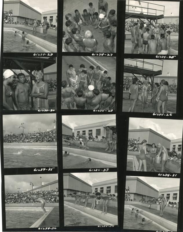 - Collage of pictures with swimmers learning from Greta Anderson, 1930.