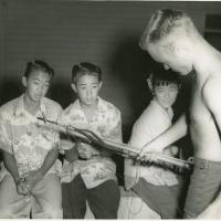 Group of youths looking at a harpoon, 1960.