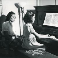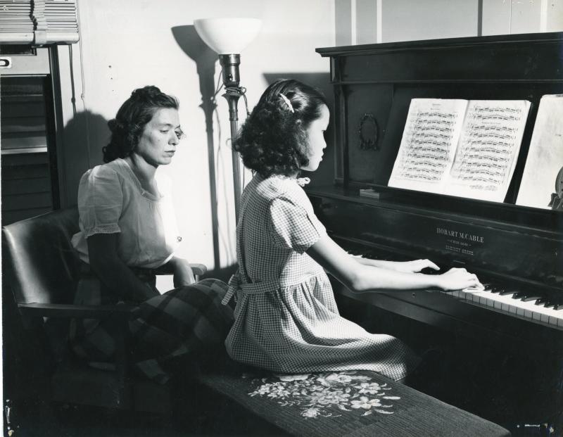 Lois Lau receives her weekly half-hour lesson from piano instructor Hope Troyer, 1946-1951.