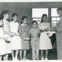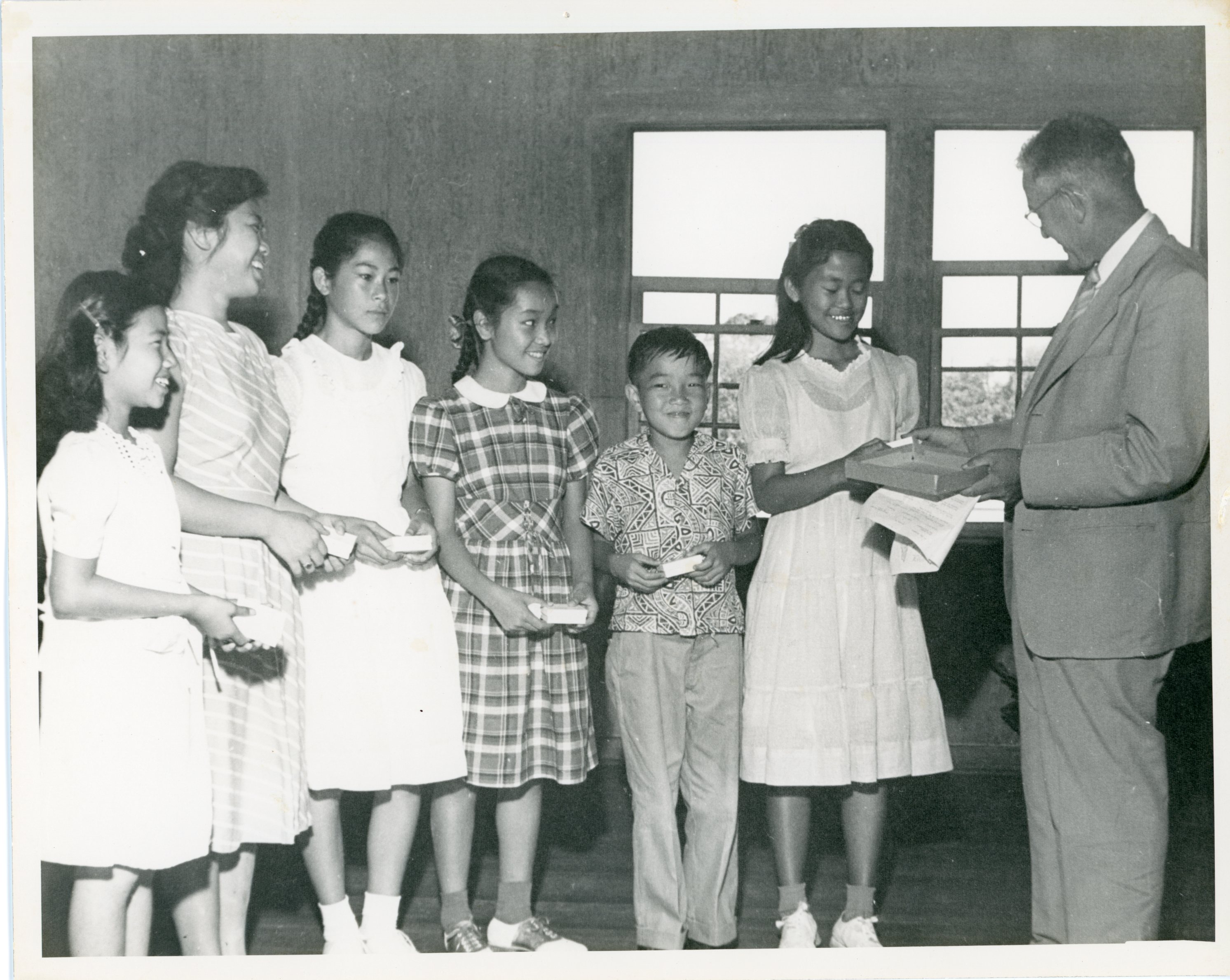 Palama Settlement's Executive Director Theodore Rhea hands awards to second year music school students, June 6, 1948, 2:30 p.m.