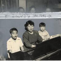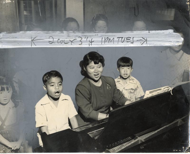 Miss Dorothy Chun, Director of the Palama Settlement Music School, is harmonizing with two neighborhood youngsters who can sing for the joy of singing. The music school offers a weekly class, Music for the Community, in just such singing. Palama's school also offers private lessons in piano, voice, wind, brass and string instruments as well as the theory of music. In addition, the music school has organized a Glee club to give students experience in choral work. The school's spring term opened Monday. All classes are open to student enrollment.