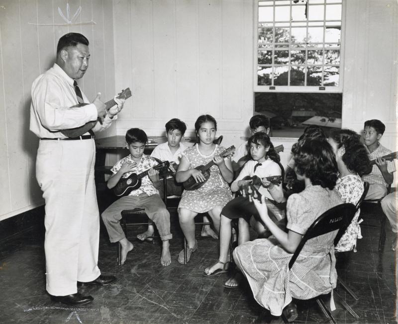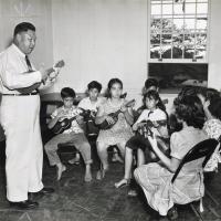 - Willam Lum teaches a Ukulele beginner's class to young students.