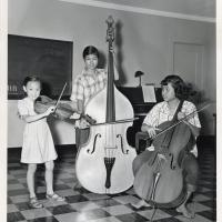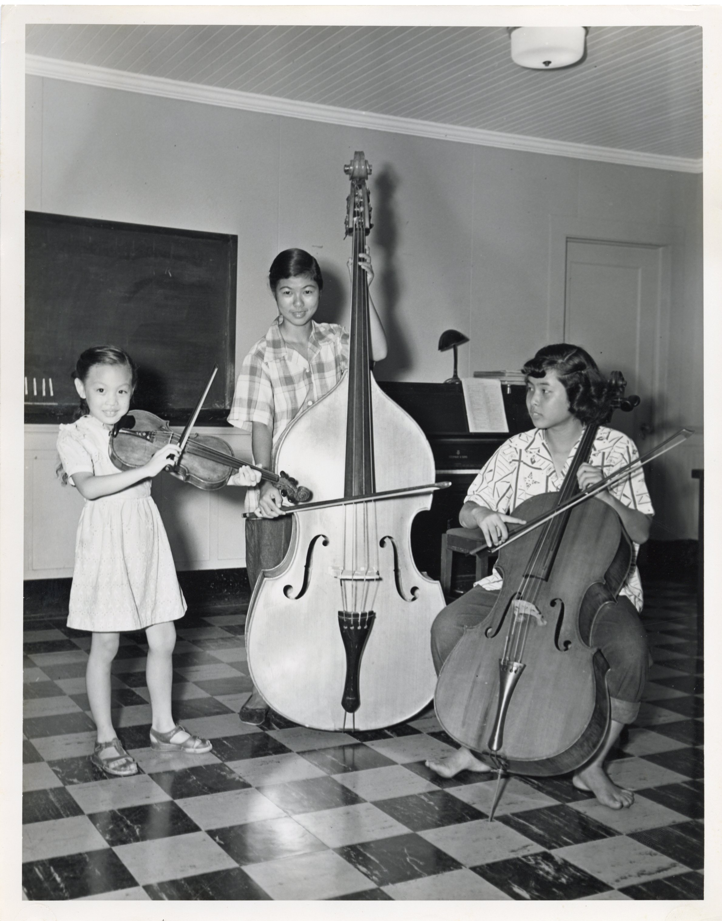 - Music school students (l-r) Diana Lau, Judy Tamanaha, and Florence Yoneyama pose with their string instruments.