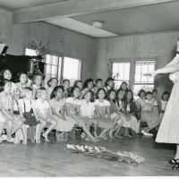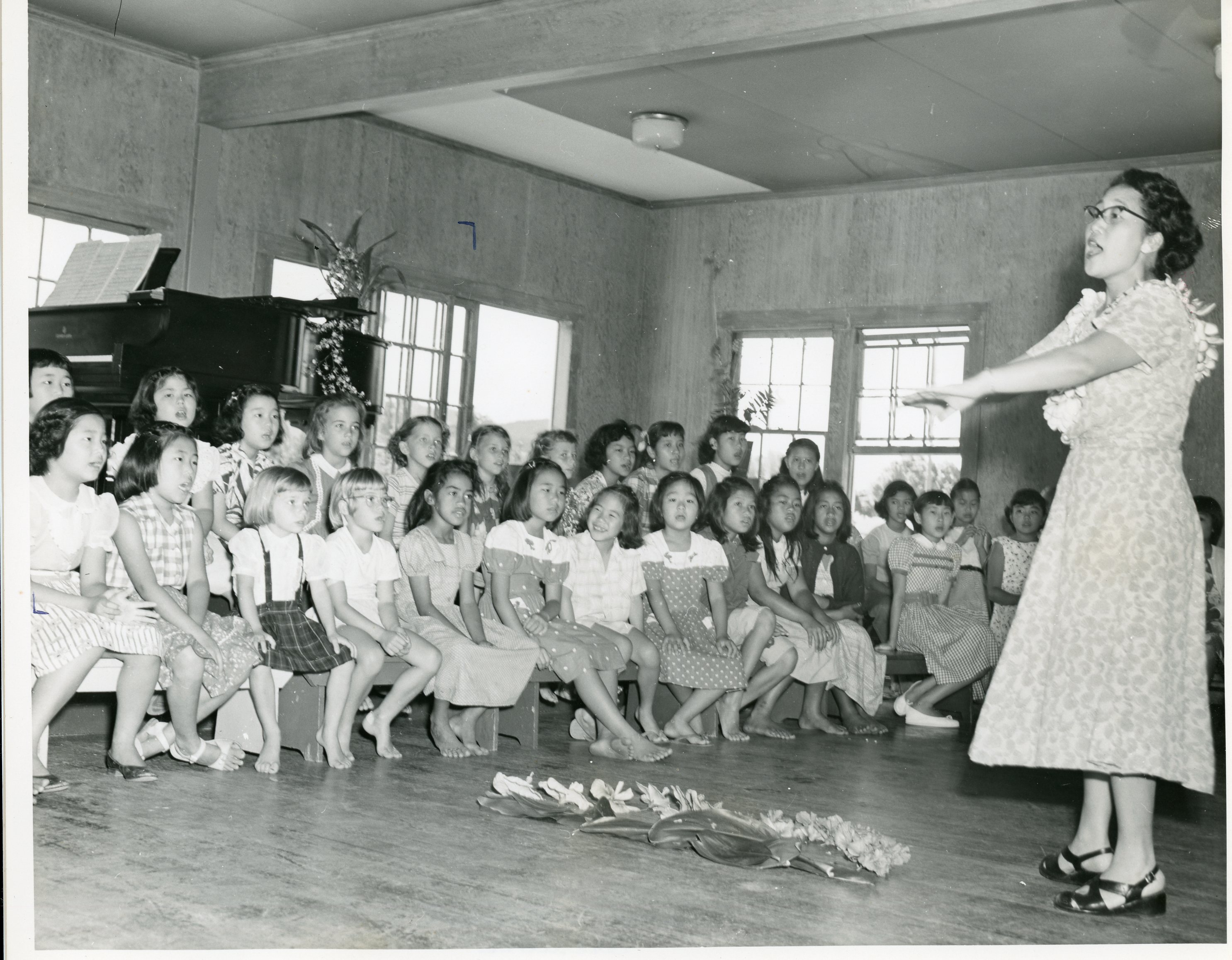 - Keum Nyu Park leads the children's chorus at the Palama Settlement Music School, March 1954.