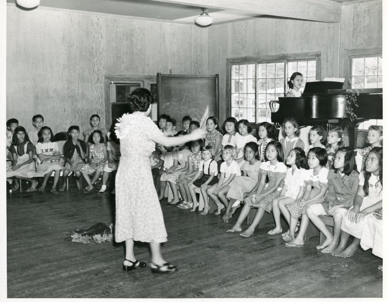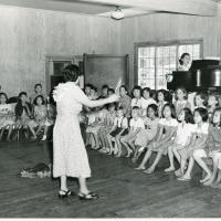 - Keum Nyu Park leads the children's chorus at the Palama Settlement Music School, March 1954.