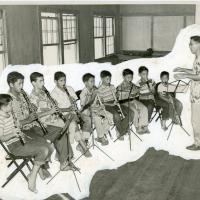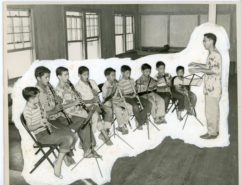 Eugene Yonamine rehearses the clarinet section of the Palama Settlement band, which gets active support from the Kiwanis Club of Honolulu, November 6, 1954.