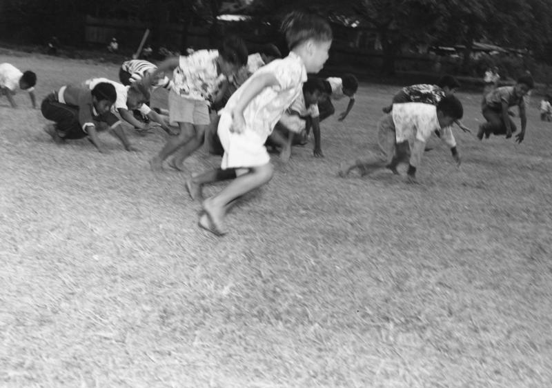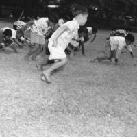 - Youth boys frog leaping across field at Palama Settlement, 1935.