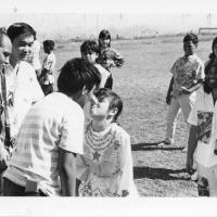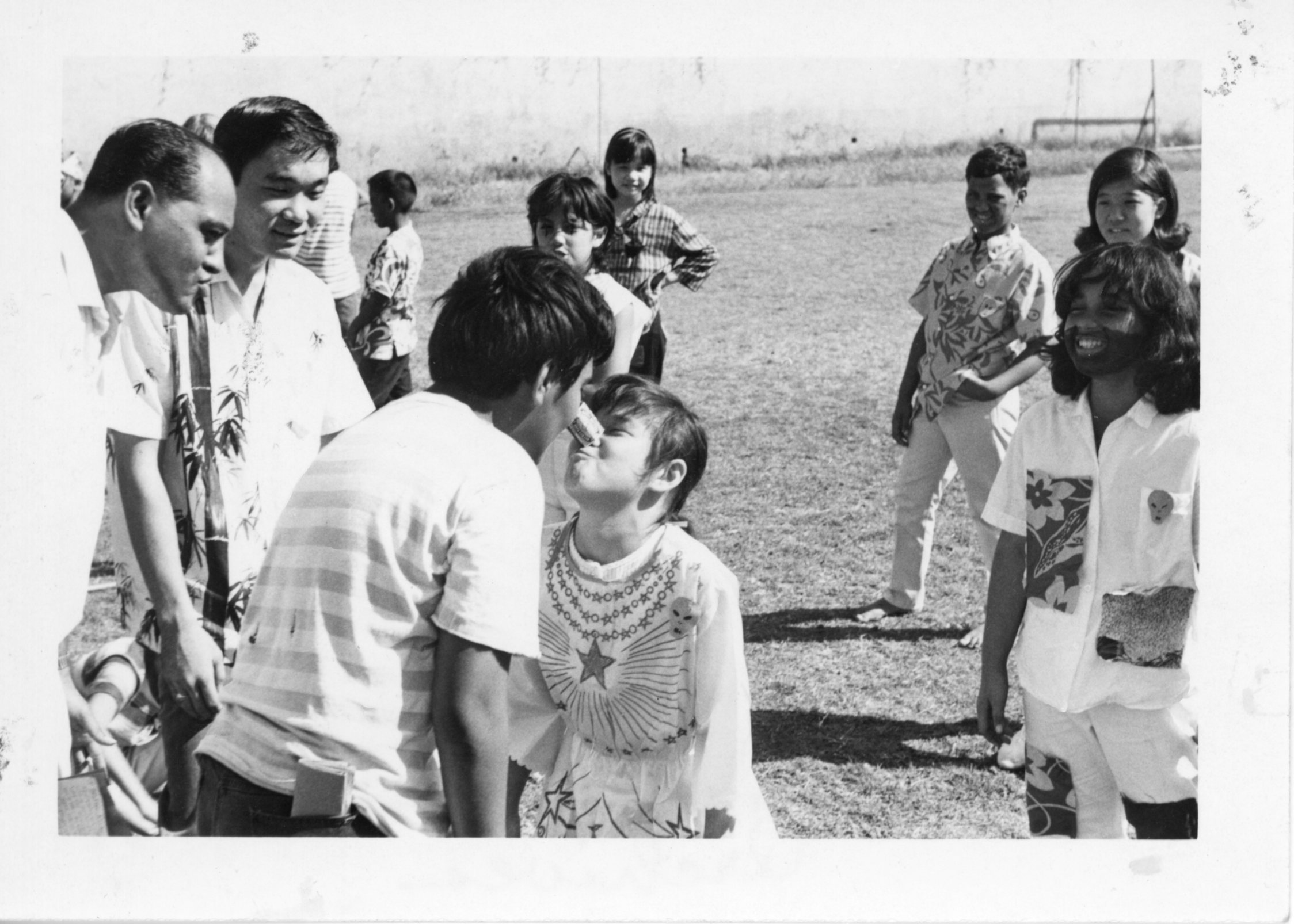 - A boy and girl playing pass the box with their face without using hands at Palama Settlement field, 1940-1950.