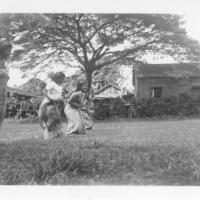 Youth girls sack racing at Palama Settlement field, 1940-1950.