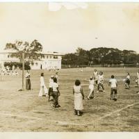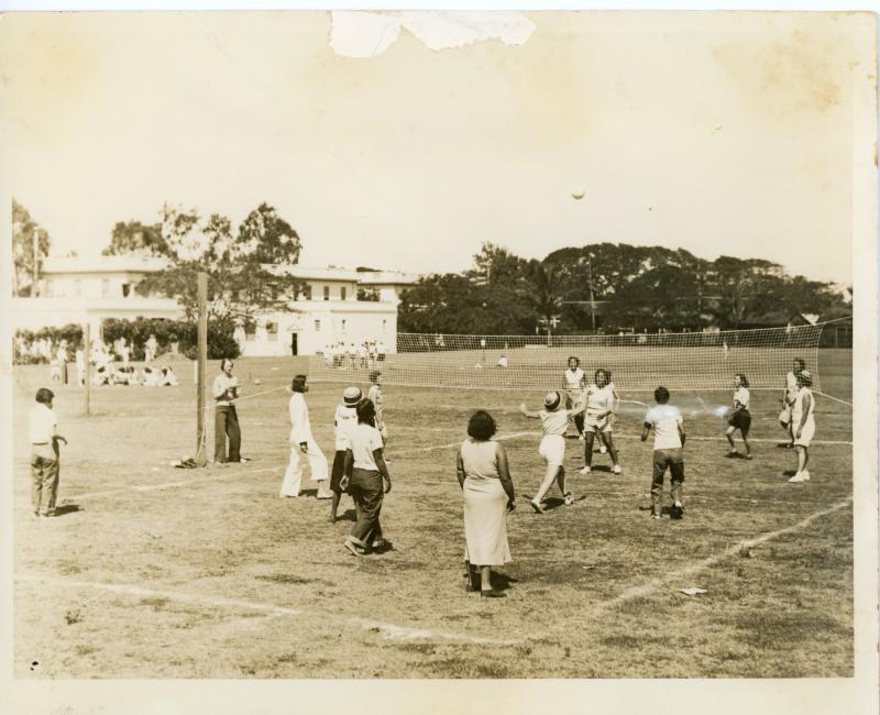 Teenage girls playing volley ball at Palama Settlement field, 1954.