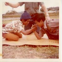 - Youth boys arm wrestling at Palama Settlement field, 1973.