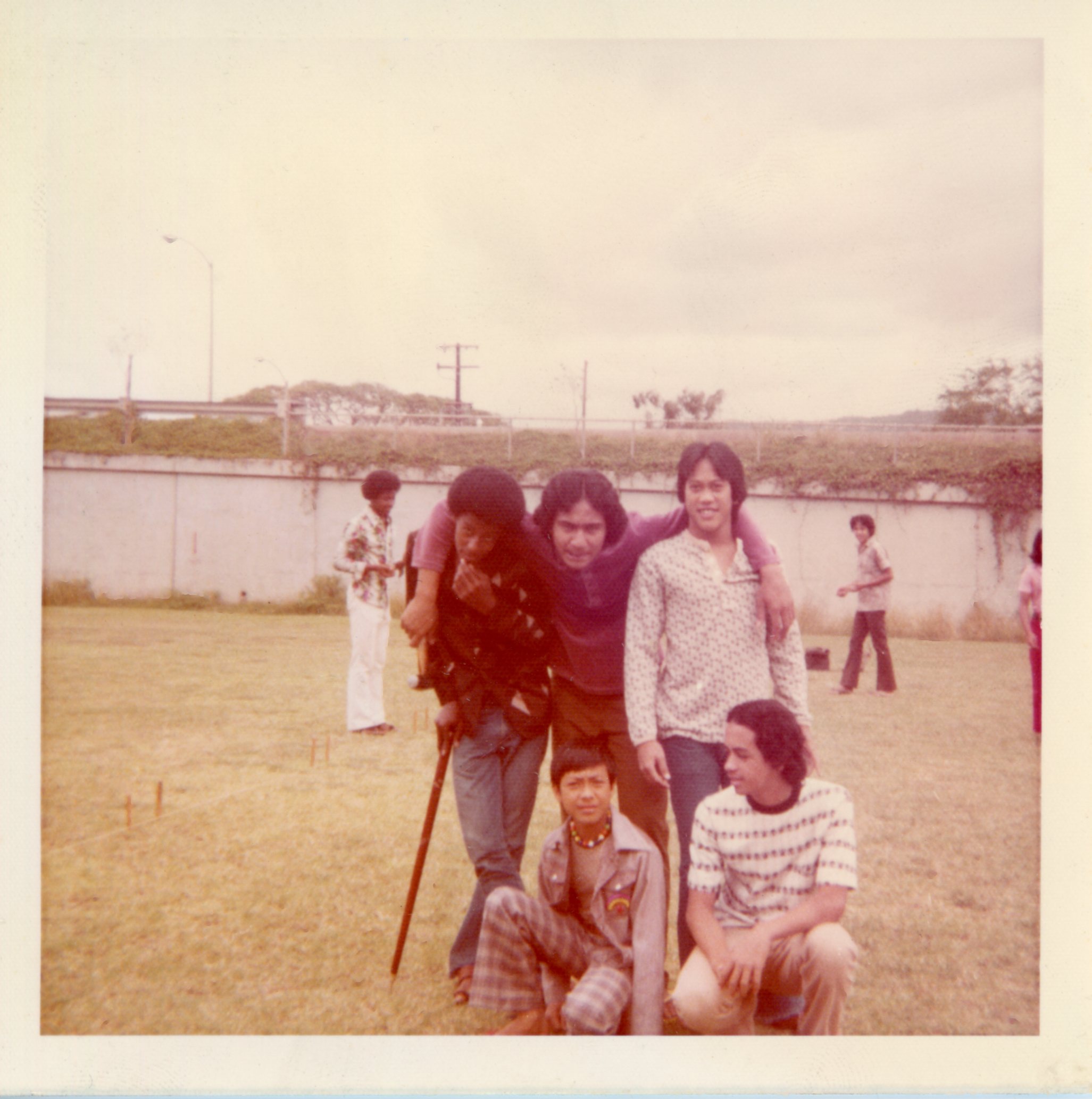 Teenage boys posing for a photo at Palama Settlement field, April 1973.