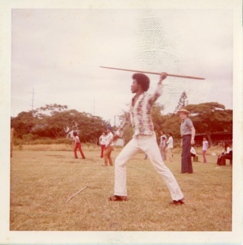 Teenage boys spearing throwing at Palama Settlement field, April 1973.