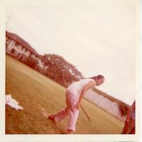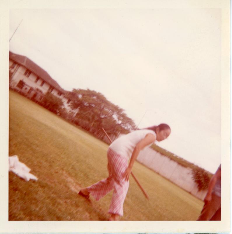 - Female in ready stance to spear throw at Palama Settlement field, April 1973.