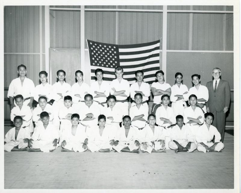 - Judo class poses for photo with Arne Larson Executive Director, 1959-62.