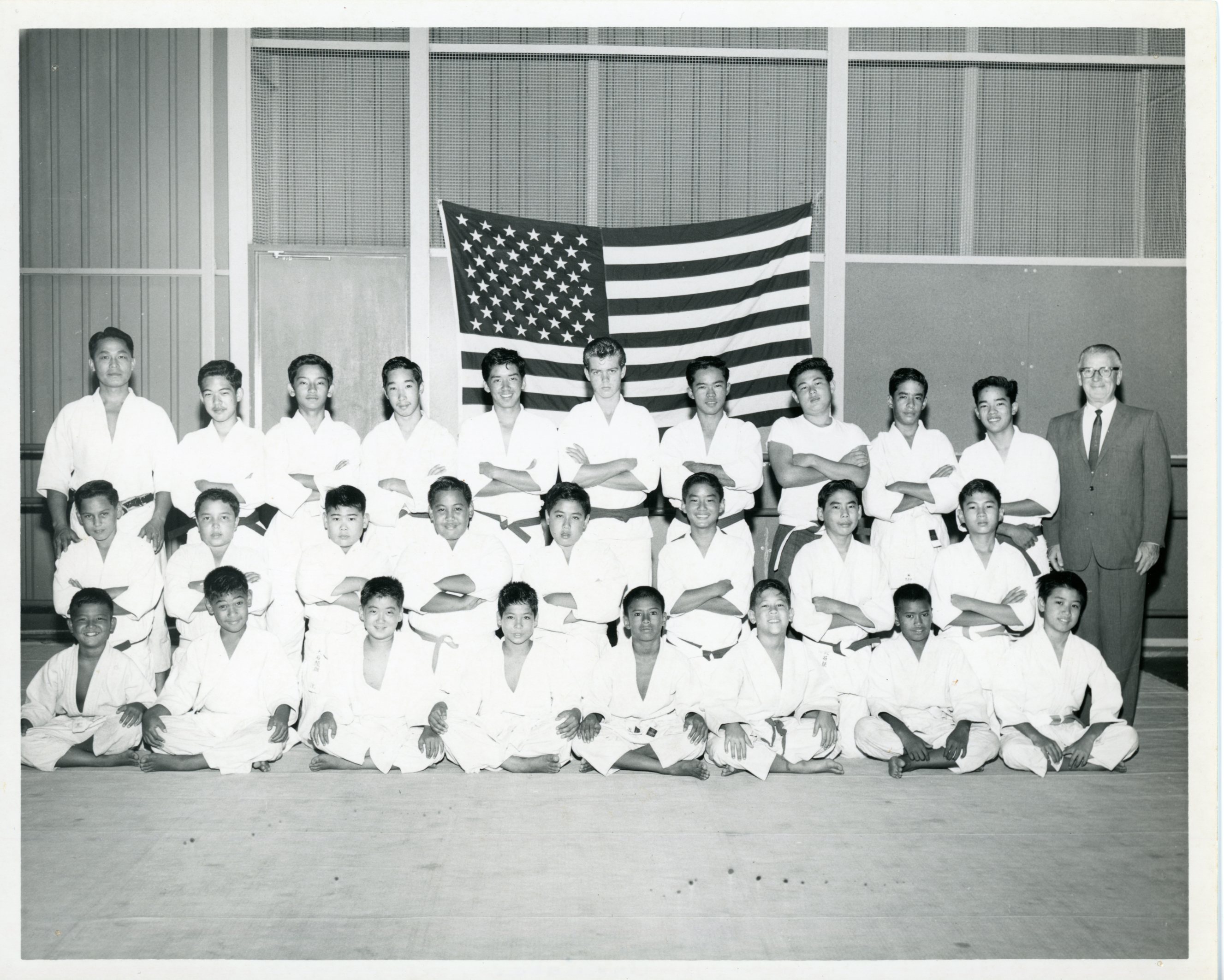 Judo class poses for photo with Arne Larson Executive Director, 1959-62.
