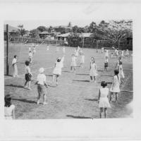 - A group of girls playing volleyball at Palama Settlement field, 1945-1960.