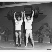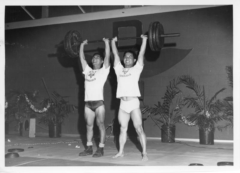 - Elmer Tomita and another male lifting a barbell together, 1950-1960.