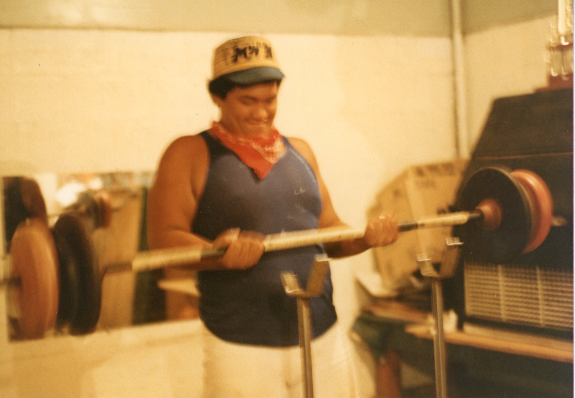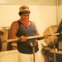 A male lifting a barbell, 1960-1970.