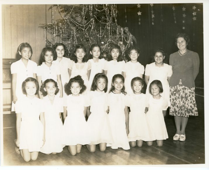 Palama choir, 1947. Front row, (L-R): Ruby Dewa, Margaret Iwamoto, Esther So, Michiko Uno, Alice Barnes, Jennie Lee, Dorothy Chun, Ted Rhea.