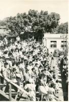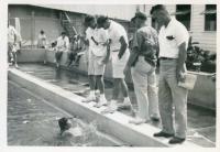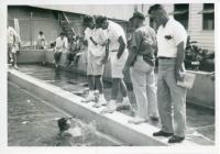 Swim meet officials timing a swimmer in Palama Settlement pool, 1950.
