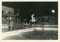 Swimmers jumping into Palama Settlement pool off of the diving board, 1962.